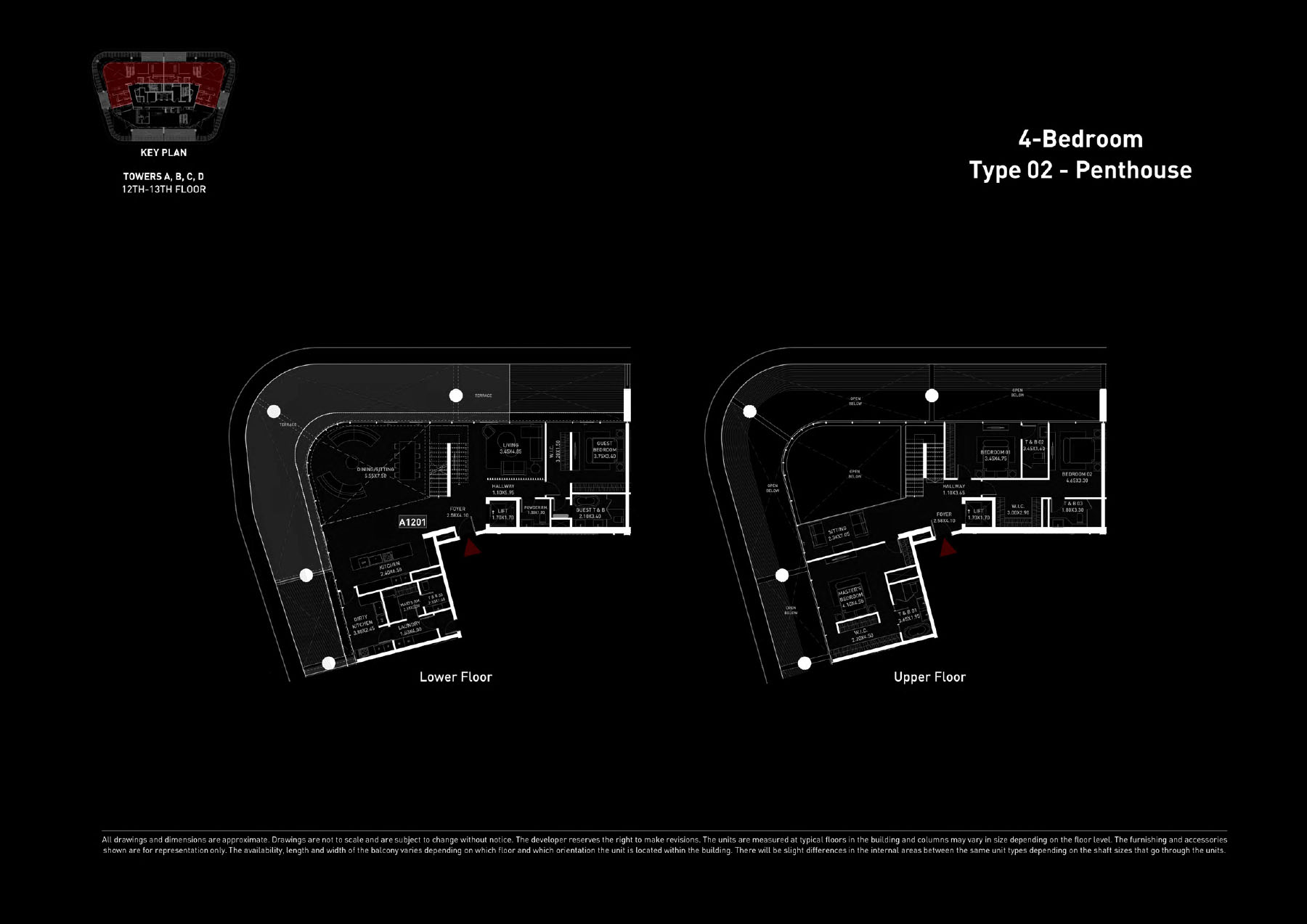 | 12TH & 13TH FLOORS | 4 Bedrooms + Maid | TOWER A, B, C, D – Type 02 to TOWER A, B, C, D – Type 03 | Various Sizes | Penthouse | See floor plan |