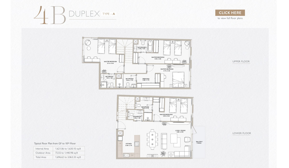 | 4 Bedroom | Duplex, Type A to Duplex, Type D | 2322.01 to 3411.97 Sq Ft | Apartments | See floor plan |