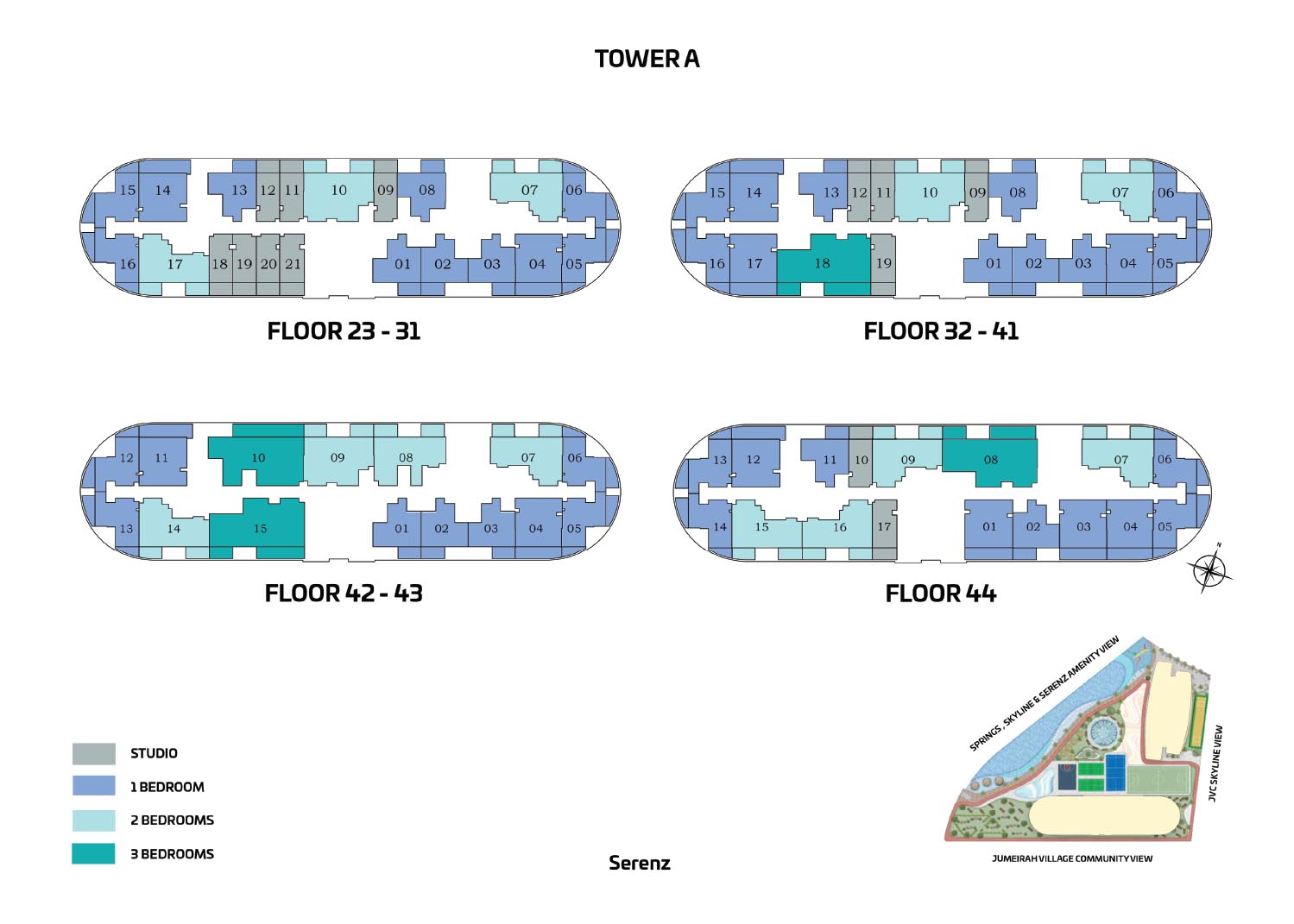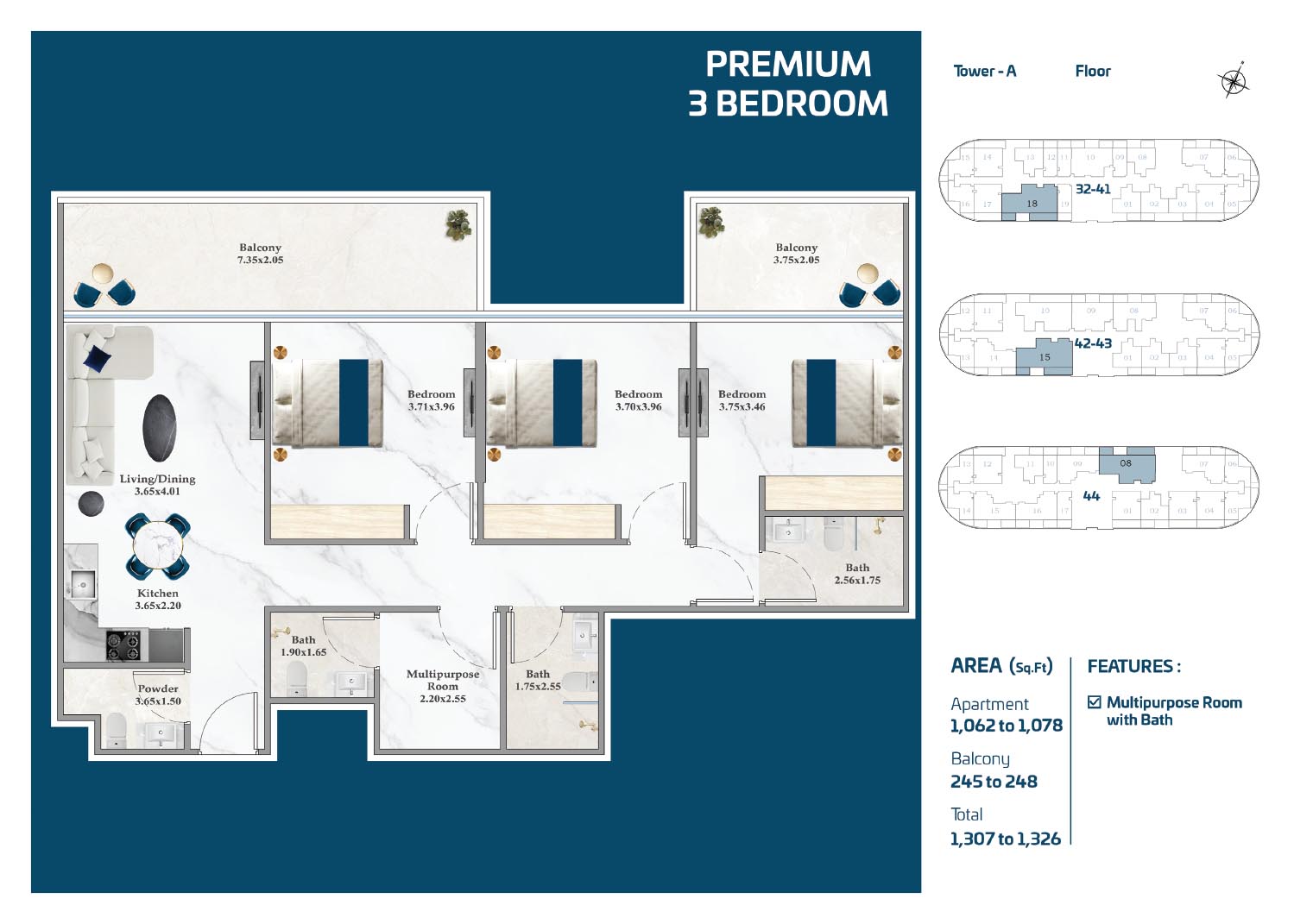 | Tower A | 3 Bedrooms | Floor 32 – 44 (Premium 3BR Unit 08-18) | 1326.00 to 1326.00 Sq Ft | Apartment | See floor plan |